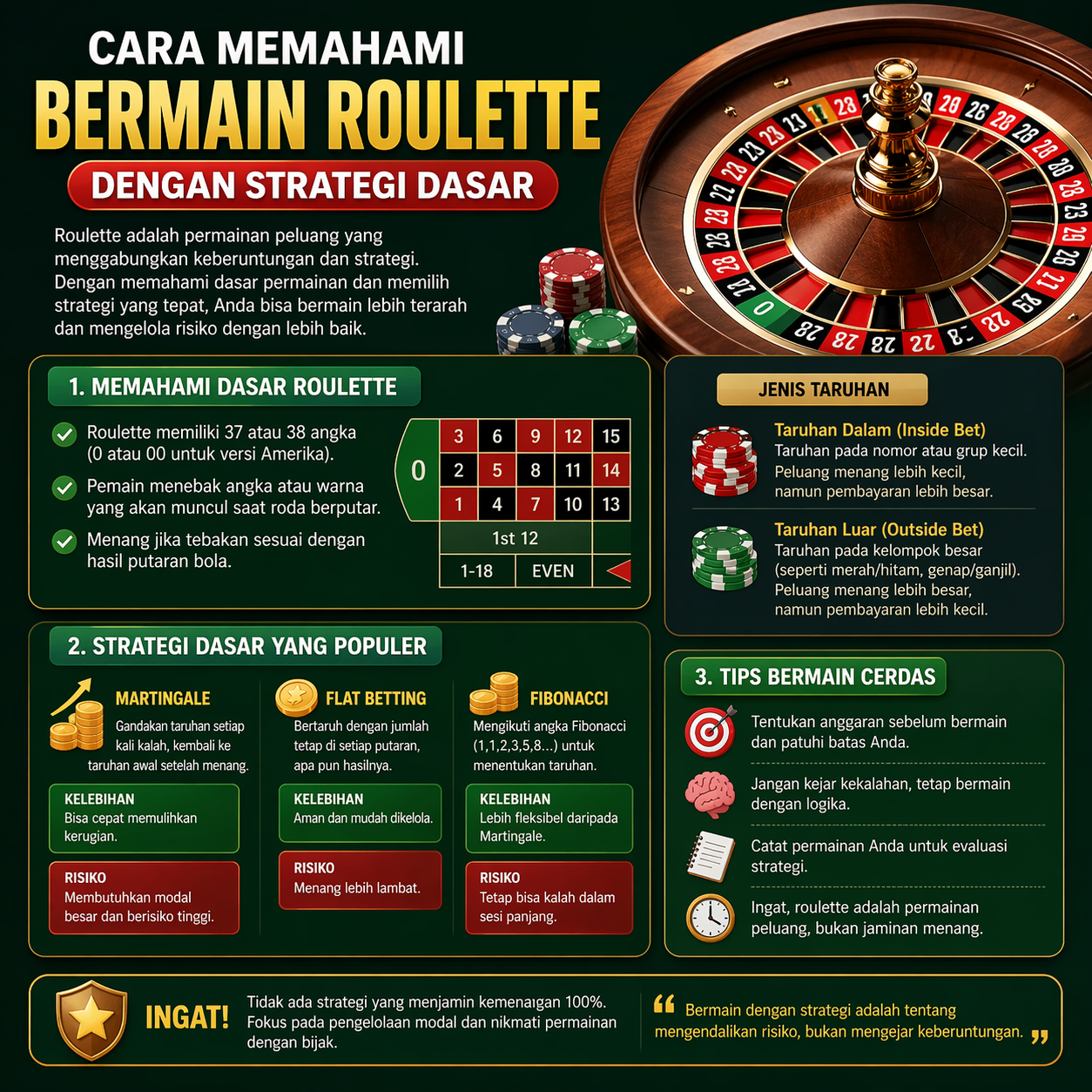 Dalam proses memahami bermain roulette, langkah pertama yang perlu Anda kuasai adalah mengenali jenis taruhan yang tersedia. Mulai dari taruhan dalam (inside bet) seperti angka tunggal, hingga taruhan luar (outside bet) seperti merah atau hitam. Setiap pilihan memiliki tingkat risiko dan peluang yang berbeda. Pendekatan ini penting karena akan membantu Anda menentukan strategi dasar yang sesuai dengan gaya bermain Anda. Pemahaman ini juga merupakan bagian dari prinsip E-E-A-T (Experience, Expertise, Authoritativeness, Trustworthiness), di mana pengalaman dan pengetahuan menjadi fondasi utama sebelum mengambil keputusan.